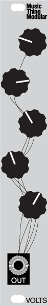 • It acts like a variable 5-bit digital-to-analog converter, taking 5 bits from the Turing Machine GATES expansion port, running them through five potentiometers and giving one summed voltage output.