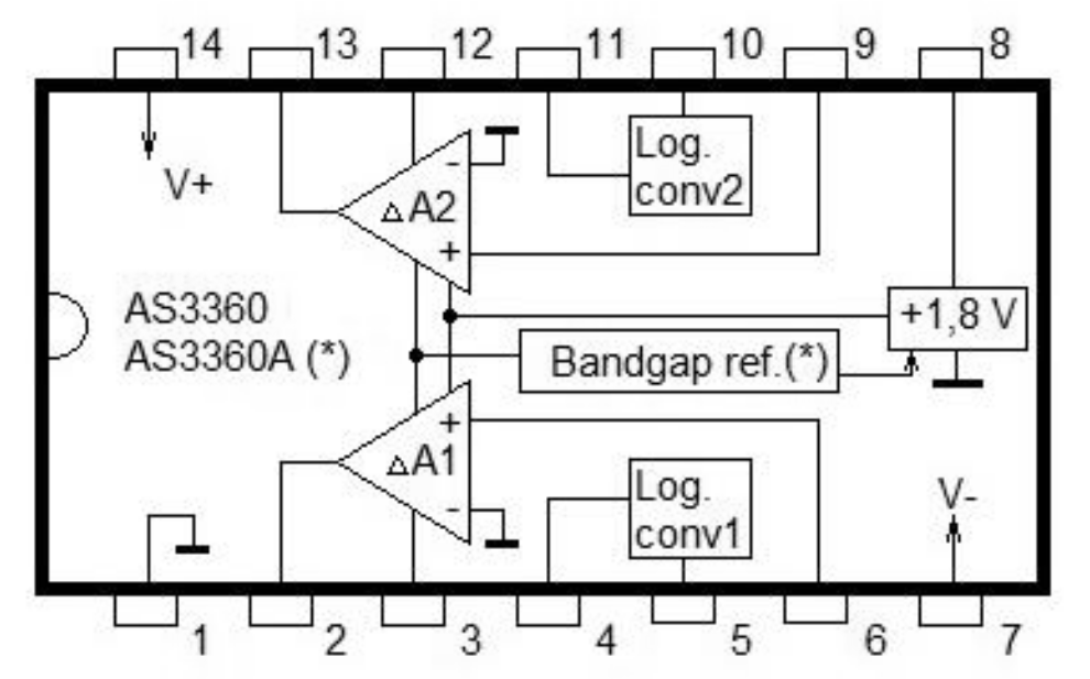 AS3360A benefits from internal bandgap reference which improves stability of reference voltage and output current of VCA and improved level of attenuation of output current at zero control voltage.