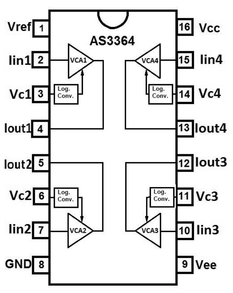 The AS3364 is a quad general purpose voltage linearly controlled VCA intended for such applications as voltage controlled amplifiers, filters, and waveform generators. Each VCA independently provides linear control scaling over greater than a 100 dB range. Complete with virtual ground summing inputs, wide voltage compliance current outputs, and control inputs referenced to ground, the AS3364 requires exceptionally few external components and is extremely easy to use.