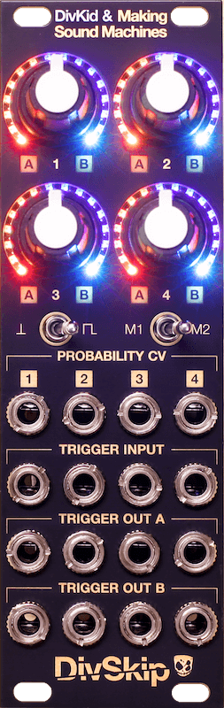 DivSkip is a 4 Channel Trigger and Gate Processor, with loads of great modes. Bernoulli Gates, Clock Division, Turing, Euclidean Split, Euclidean Classic, Ramp / Gate Length, Retrigger and Pattern.