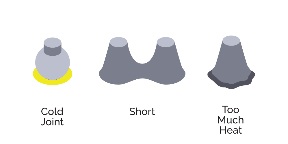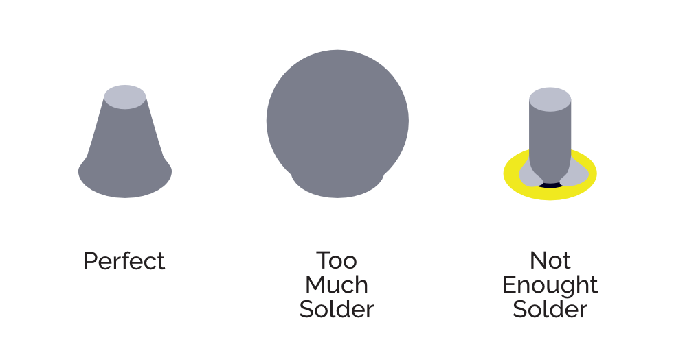 A good solder joint is volcano- or cone- shaped and appears shiny and smooth. Don’t apply too much solder. You want to avoid solder balls or overflow into nearby holes, as this could cause a short circuit and potentially damage your project.