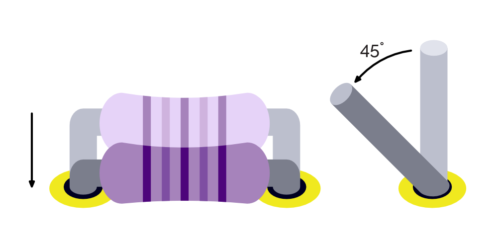 Start by placing the component into the designated holes and securing it by gently bending the legs sideways at about 45°. Avoid over-bending, as this can stress or even break the leads and make future desoldering more difficult.