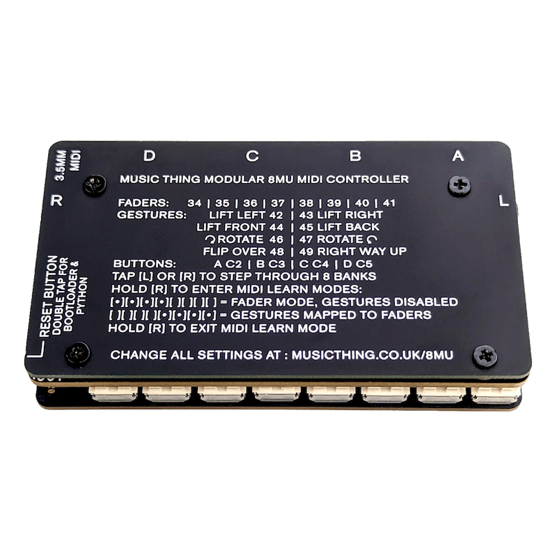 The 8mu is a pocket-sized MIDI controller (slightly smaller than a credit card!) with eight faders that can send messages via MIDI. The 8mu also has a built in accelerometer which measures how the device is being held. This creates eight more control signals, mapped to gestures like “lift the front” or “turn me over”. There are four tiny buttons along the top edge, which can be configured to send MIDI notes (like a keyboard) or control signals.