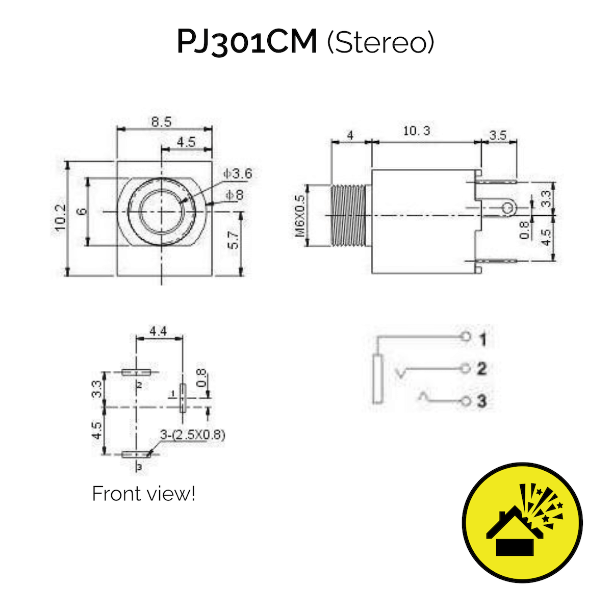 PJ301CM is a 3,5mm stereo connector, which is quite popuular and used in some designs recently. Please check the measurements on the picture.