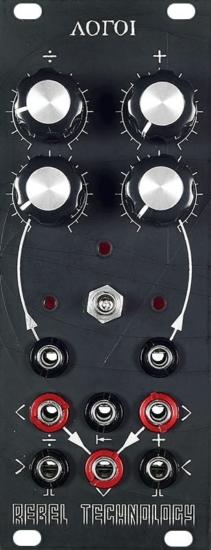 Λόγοι is a voltage controlled clock divider, counter, and delay. It subdivides and adds time, creating organic, evolving signatures. Λόγοι brings movement and life to the trigger signal, from a subtle swing to bizarrely complex and intricate rhythms. Instructions The functions of Λόγοι are split with division on the left, and addition on the right. The right side operates either in Counter mode, by adding clocks, or Swing mode, by adding a time delay. The mode is set by the centre switch. The module has CV inputs (top jacks) and trigger outputs (middle left/right jacks) for each side, and a combined trigger output (centre bottom jack) which gives the output of both operations: divide and add. The trigger input (bottom left and right jacks) is shared between division and addition. There is also a reset input (middle centre jack) and manual reset switch (push switch up). There are three LEDs indicating the divided and added output to the left and right, and the combined output in the centre. Divide The divider toggles its output every n clocks, where n is the divisor. The divisor is set with a manual (top knob) and CV level control, in a range from 1 to 32. Count With the switch in the down position, the additive side functions as clock counter. The counter will output a trigger signal every m clocks, where m is the addend. The range is from 1 to 32 clocks, with 16 in the centre position. The combined output will divide and count. If i is the incoming clock, n the divisor, and m the addend, then it will output a a trigger signal every i/n + m clocks. Note that when the addend is larger than the divisor, in other words, n < m, then the divider frequency is higher than the addition and the combined output will never trigger. Swing With the switch in the centre position, the right side adds a time delay to the input. The amount of delay, or swing, ranges from 0ms to around 1000ms. In Swing mode, the combined output passes all clocks through until each time the divisor triggers, when it adds a time delay. The result is that every n-th clock is delayed by m, where m is the amount of swing and n is the divisor. As in Count mode, if the divisor frequency is greater than the delay time, the combined output will not trigger. In Swing mode, this is determined by the combination of input clock frequency and delay time. DIY-Kit-Type: THT-Kit-1. This is a Do-It-Yourself kit, not an assembled module. The kit includes all parts to build the module. Only trough-hole parts to solder. Make sure to check the build guide before you buy. For build guide, more info, videos etc. please check the buttons below.