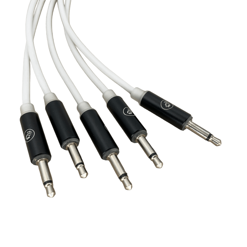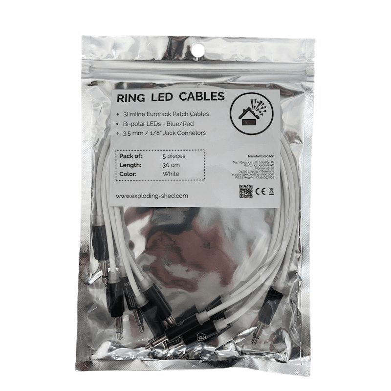 Sexy slimline LED patch-cables made of very flexible TPE material with a nice soft and rubbery feel. Each connector features a red and blue LED, which alter by polarity of your signal. They feature slim aluminum-shell connectors with Exploding Shed logo engraving. The LEDs shine out of the top and bottom of the connector what also illuminates the sockets of your module.