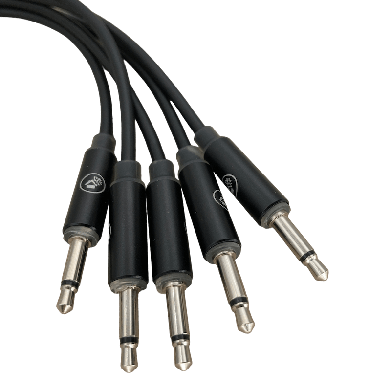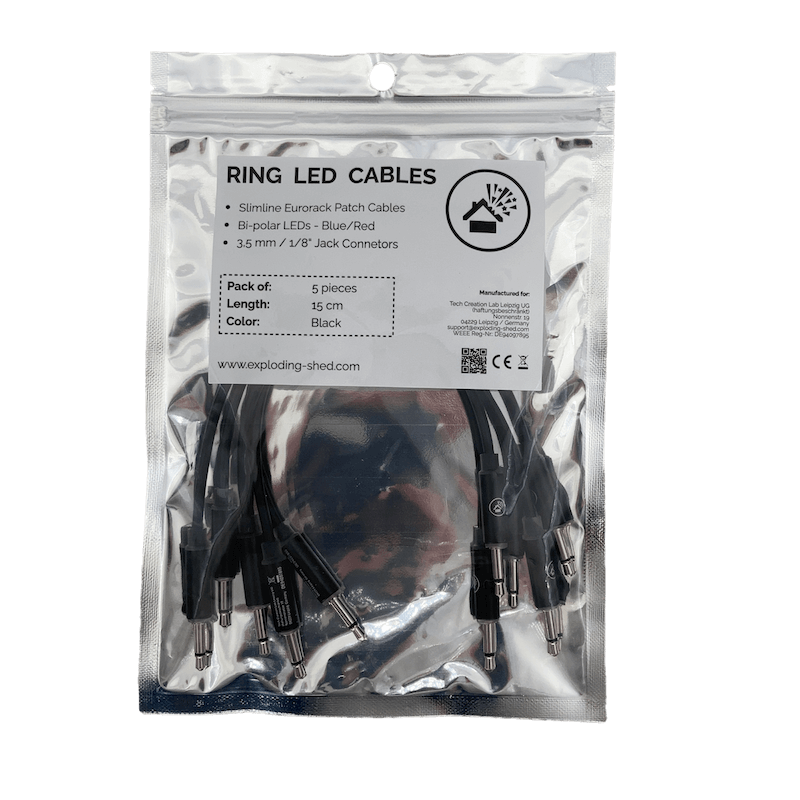 Sexy slimline LED patch-cables made of very flexible TPE material with a nice soft and rubbery feel. Each connector features a red and blue LED, which alter by polarity of your signal. They feature slim aluminum-shell connectors with Exploding Shed logo engraving. The LEDs shine out of the top and bottom of the connector what also illuminates the sockets of your module.