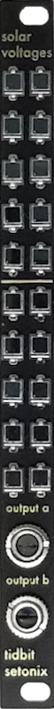 The Solar Voltages is a 2 HP, 2-channel Solar Cell module which outputs two separate control voltages in response to light. Each channel outputs approximately 0-5 V, with higher voltages corresponding to more intense and/or direct light. As the two channels can be manipulated with relative independence, the Solar Voltages makes for a great low-profile and multi-dimensional “light theremin” for direct and spontaneous control of two different parameters at once.
