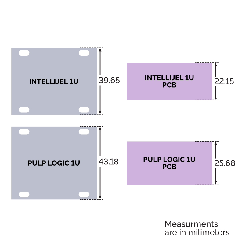 Logic 1U measures 43.18 mm, while Intellijel 1U measures 39.65 mm.
