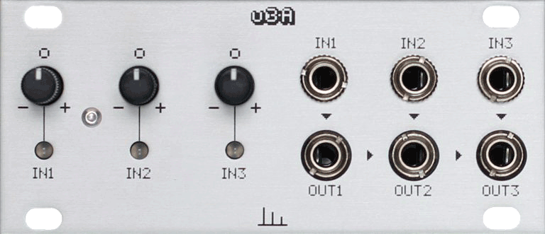The u3A (v1) is a three channel attenuverter DIY kit for the 1U Intellijel format. Useful for scale, add offset, invert or sum signals. As each input is normalled to +5V, with nothing plugged into the jacks, each knob controls a voltage range from -5V to +5V. Each output is also summed to the adjacent channel on the right when no cable is connected.