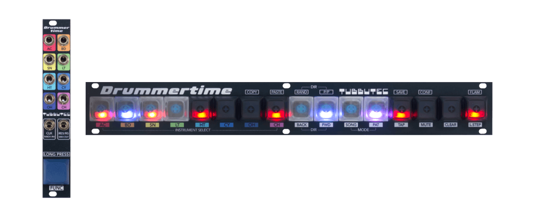 Tubbutec Drummertime is a performance-focused, TR-x0x-inspired Eurorack drum step sequencer built for fast hands-on programming and live editing. Available in multiple 1U formats, Drummertime combines large, illuminated buttons with deep sequencing features – pattern chaining, per-step probability, swing, ratchets/flams and flexible play directions – so you can sketch grooves quickly or perform complex, evolving drum arrangements in real time. Eight instrument channels give you per-step control and independent trigger outputs, while robust clocking options (internal clock with tap tempo, analog clock or MIDI clock) plus MIDI I/O make integration with both modular and MIDI ecosystems seamless. Multiple units can be linked for longer patterns or additional instruments, and the intuitive LED feedback system (red/blue/purple) keeps state information visible at a glance, making Drummertime ideal for live rigs, studio grooves and hybrid analog-MIDI workflows.