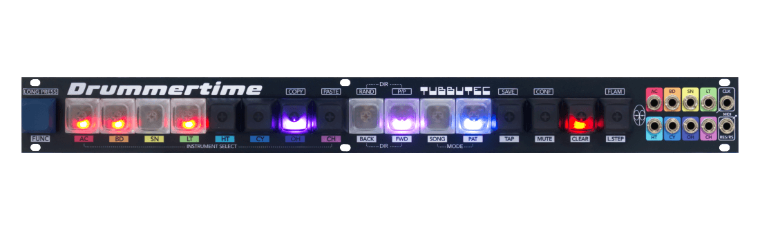 Tubbutec Drummertime is a performance-focused, TR-x0x-inspired Eurorack drum step sequencer built for fast hands-on programming and live editing. Available in multiple 1U formats, Drummertime combines large, illuminated buttons with deep sequencing features – pattern chaining, per-step probability, swing, ratchets/flams and flexible play directions – so you can sketch grooves quickly or perform complex, evolving drum arrangements in real time. Eight instrument channels give you per-step control and independent trigger outputs, while robust clocking options (internal clock with tap tempo, analog clock or MIDI clock) plus MIDI I/O make integration with both modular and MIDI ecosystems seamless. Multiple units can be linked for longer patterns or additional instruments, and the intuitive LED feedback system (red/blue/purple) keeps state information visible at a glance, making Drummertime ideal for live rigs, studio grooves and hybrid analog-MIDI workflows.