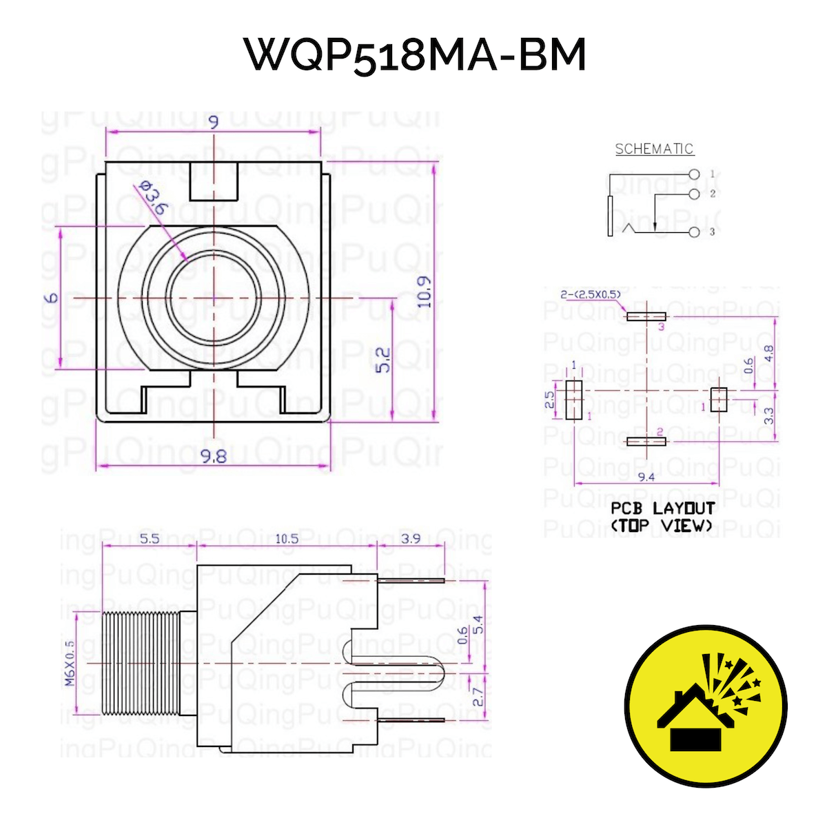 An older version was named PJ301BM, the new version is called WQP518MA-BM now, is more reliable and has a longer lifecycle. Like the newer Thonkiconns it has a rectangle tab instead of semi-round one (the part between body and threading, where the front panel will sit on) but the height is completely the same. Footprint and dimensions are the same.